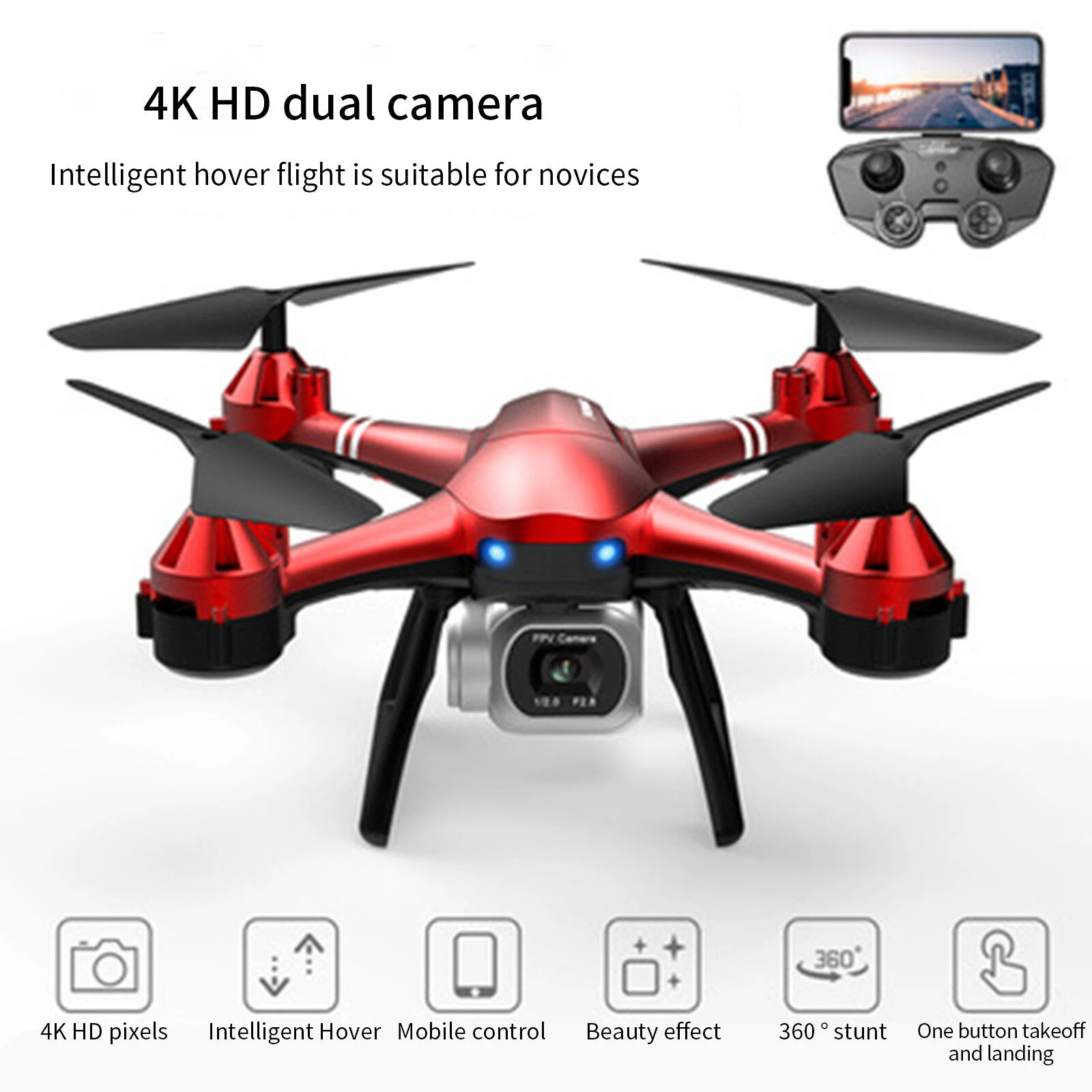 It features a front HD camera, four propellers, and LED lights for stable flight and visibility. The set includes a remote controller, spare propellers, batteries, charging cable, and carrying case, making it suitable for aerial photography, videos, and recreational flying.