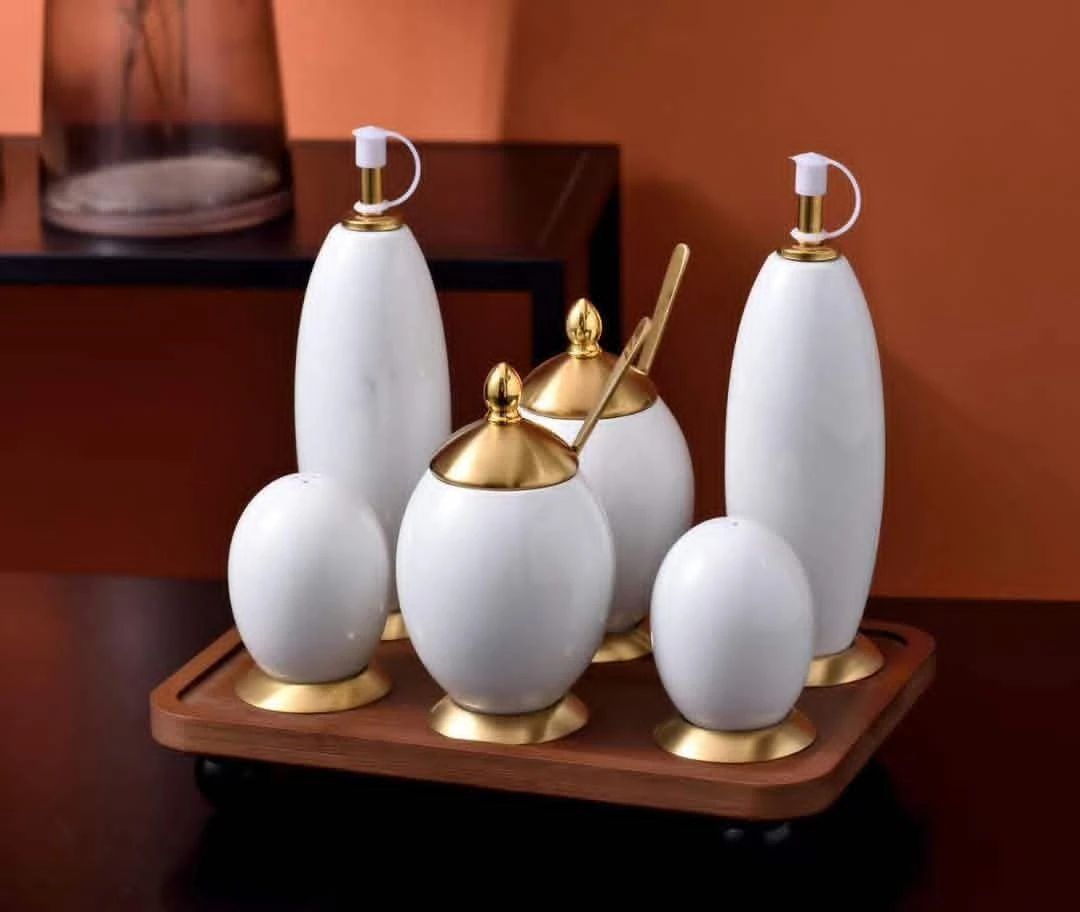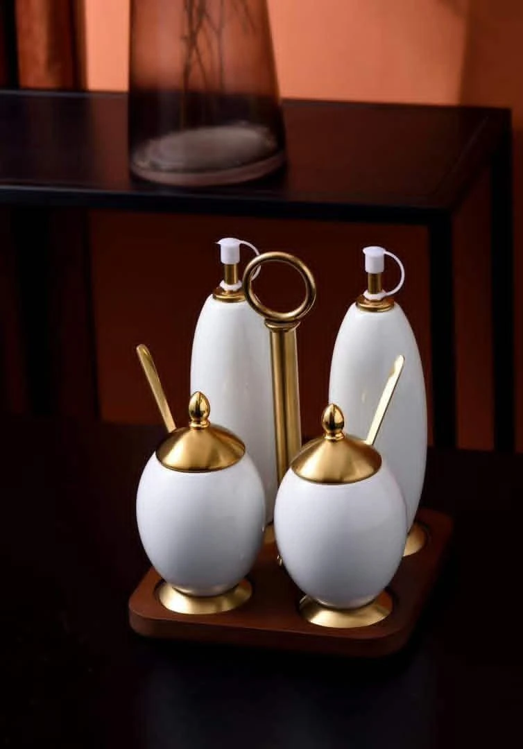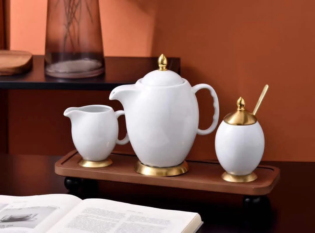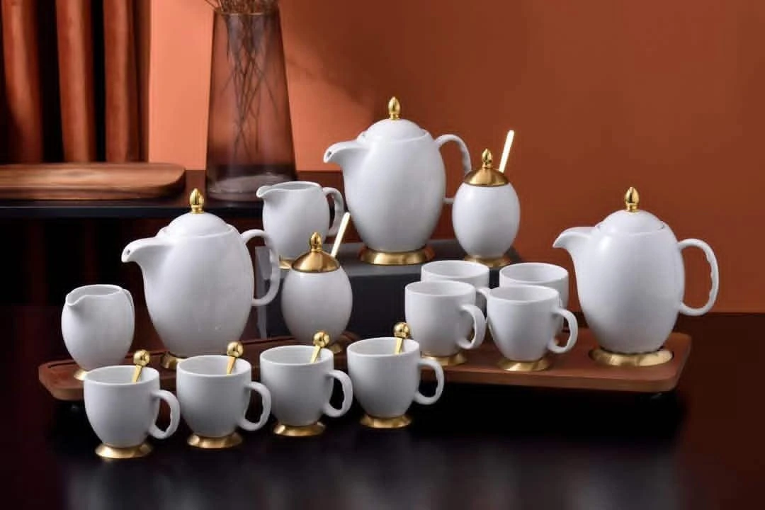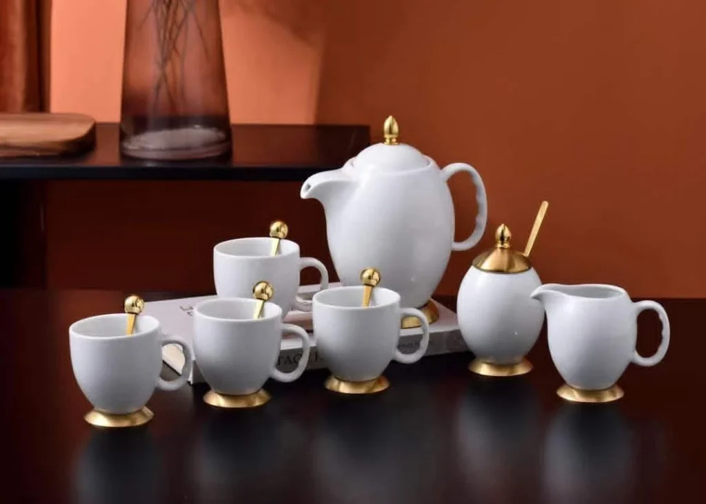 This is a luxury ceramic tea and coffee serving set with a smooth white finish and elegant gold detailing. It includes a teapot, matching cups with spoons, a sugar pot, and a creamer, all designed with a refined, modern look. Perfect for home use, guests, or special occasions, it adds a classy touch to any table setting.